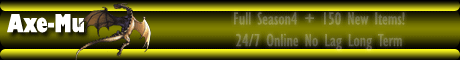 http://Axe-Mu.Sytes.Net - 4 season MuOnline server, it works 7 days per week, 24 hours per day. 79 sets, also 150 new items. That is something new in MuOnline world. Professional Game Masters will help you in the game.If you need more information write fo